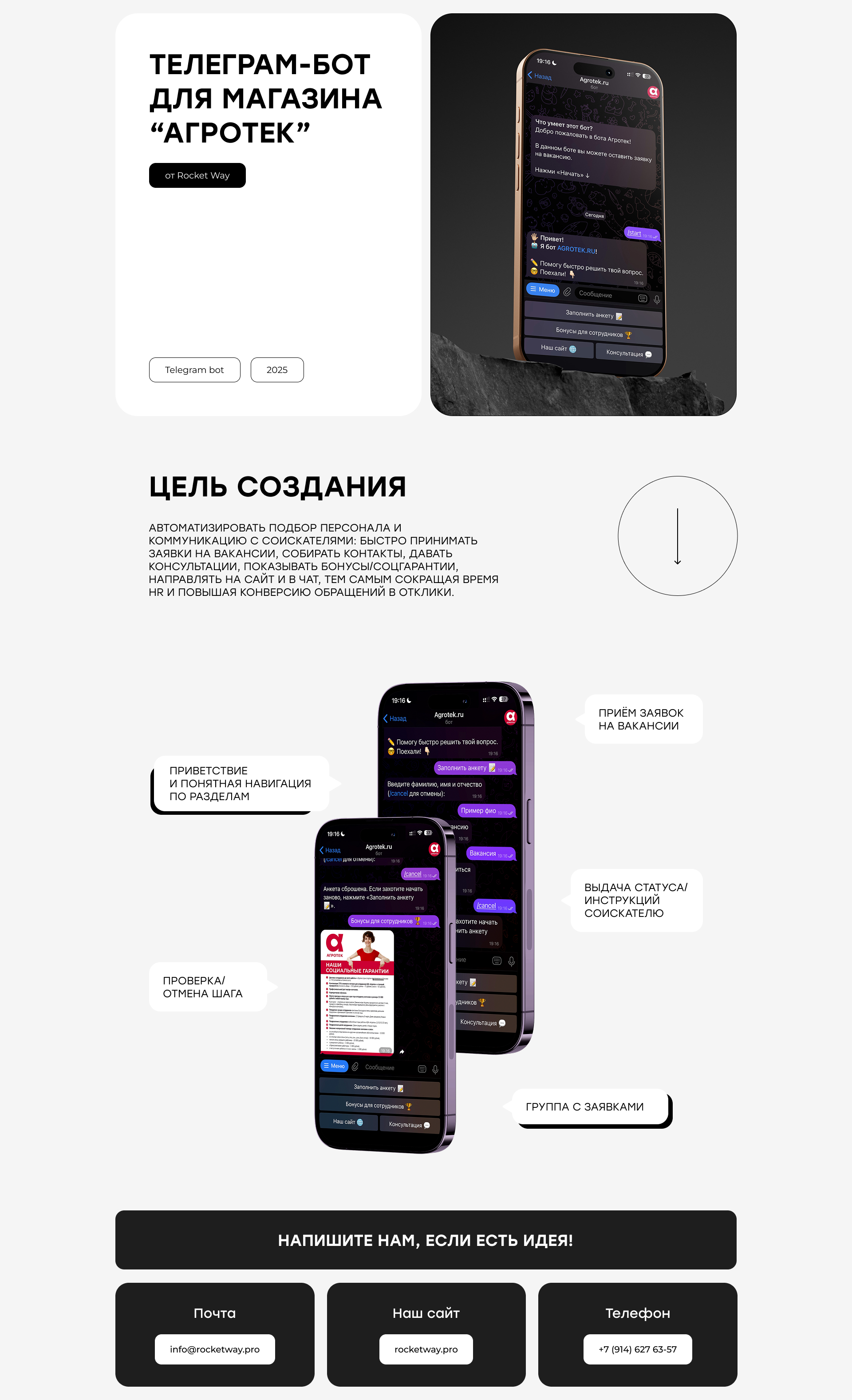 Разработали Telegram-бота для «Агротек»: автоматизировали подбор персонала, приём заявок на вакансии, сбор контактов и выдачу статусов. Бот ускорил работу HR и повысил конверсию откликов.