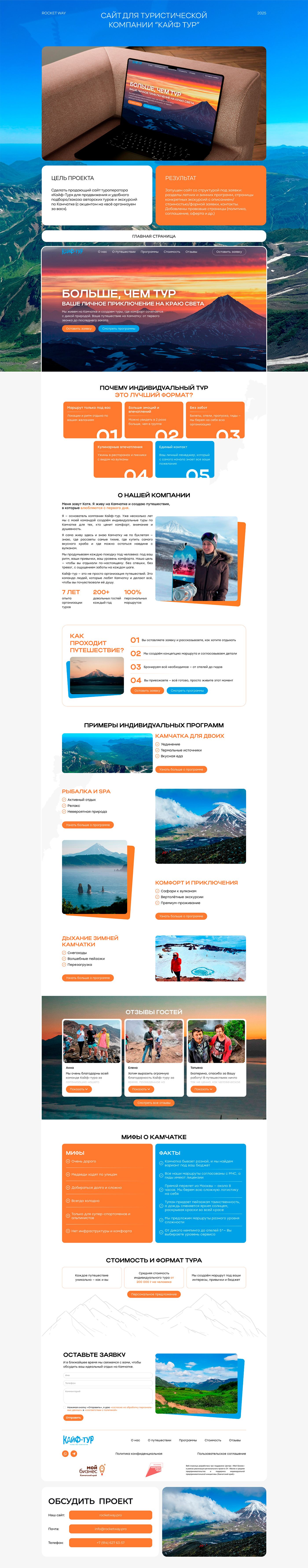 Мы разработали сайт для Кайф-Тур — сервиса авторских индивидуальных туров на Камчатку: современный лендинг с удобной структурой, акцентом на программы путешествий, отзывы гостей и онлайн-заявку на тур.