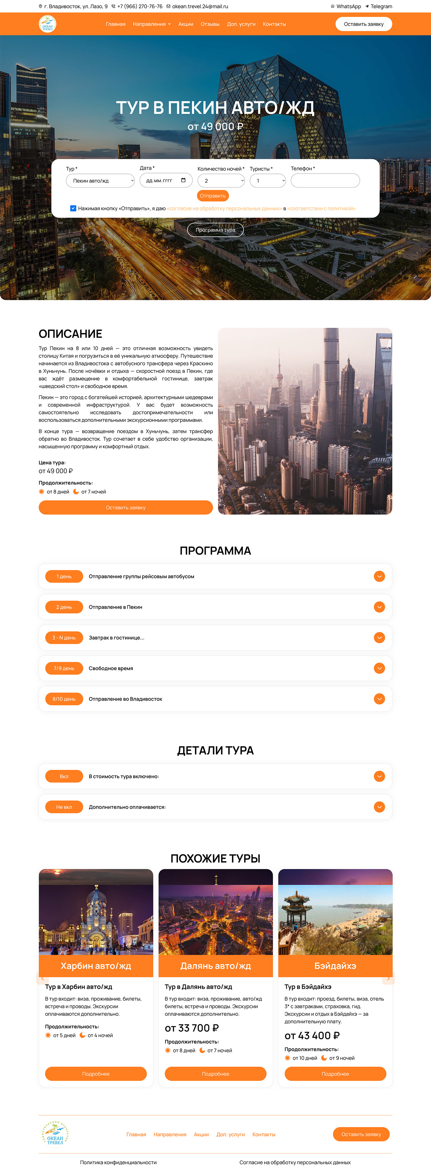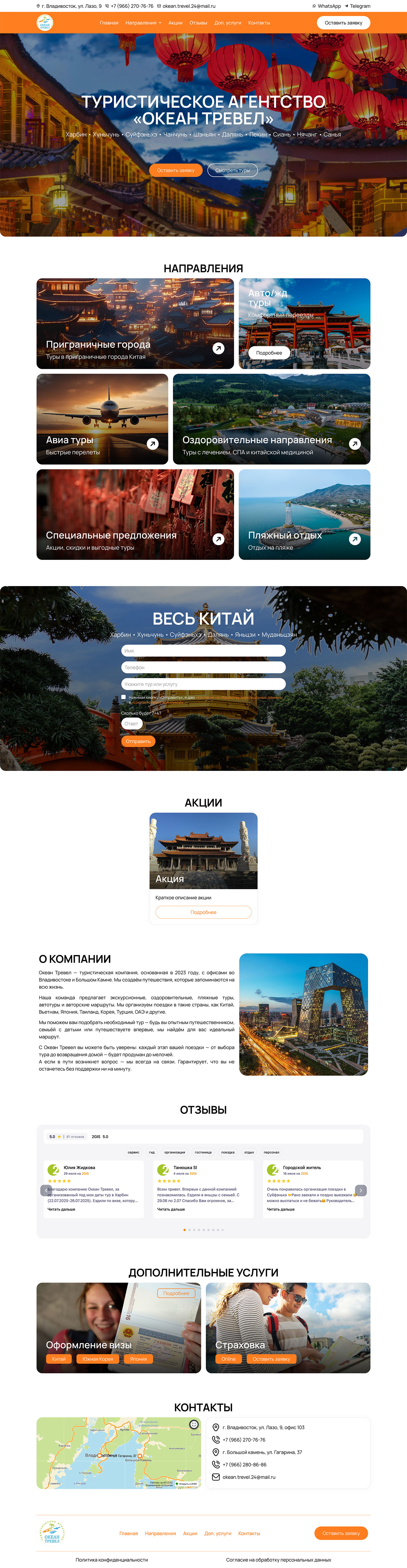 Разработали современный сайт для Ocean Travel — туристического агентства из Владивостока, специализирующегося на турах в Китай, авиабронировании и визовой поддержке.