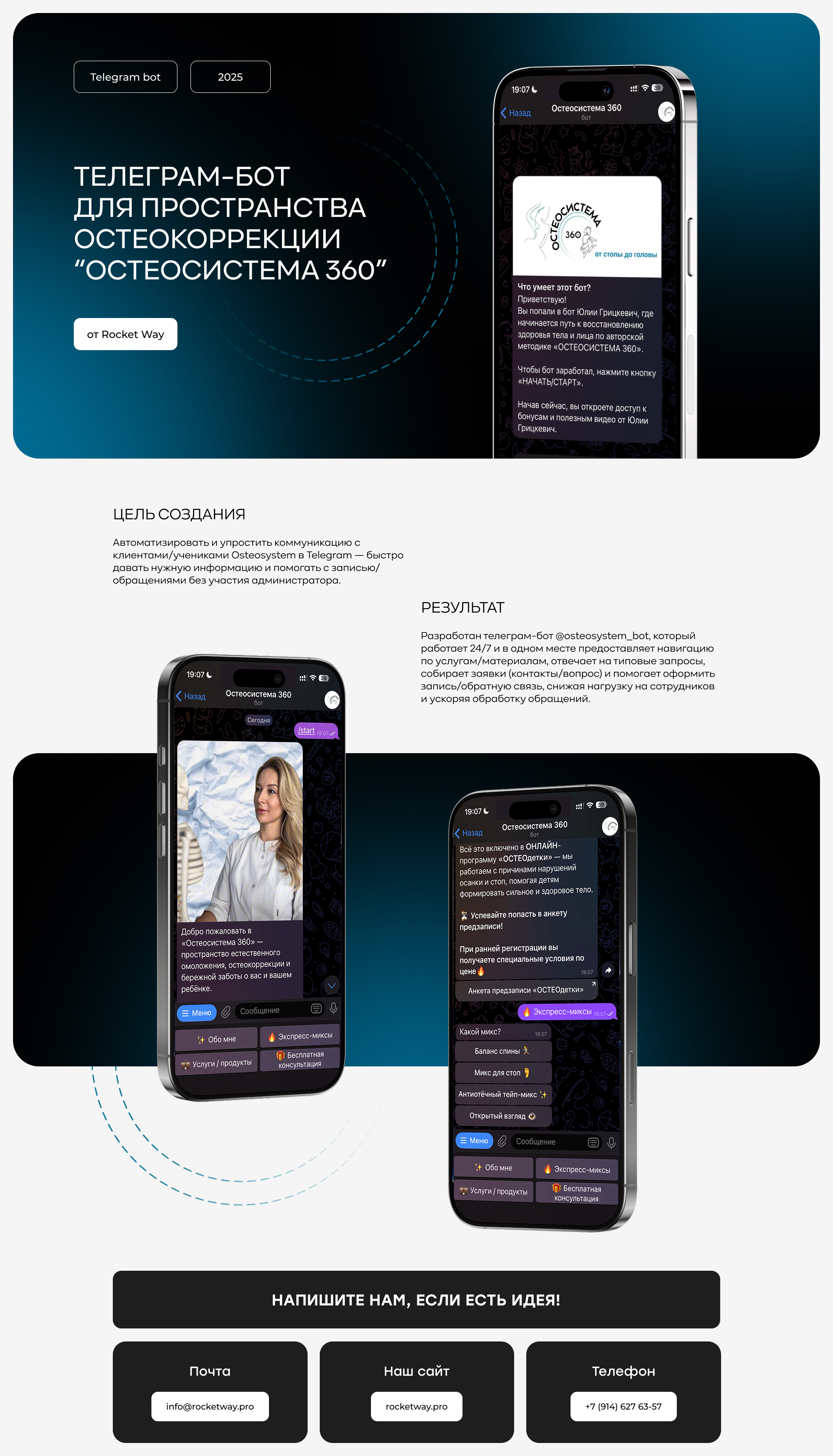 Разработали Telegram-бота для пространства остеокоррекции «Остеосистема 360»: навигация по услугам и материалам, ответы на частые вопросы, сбор заявок и контактов, запись на консультацию 24/7 без участия администратора.