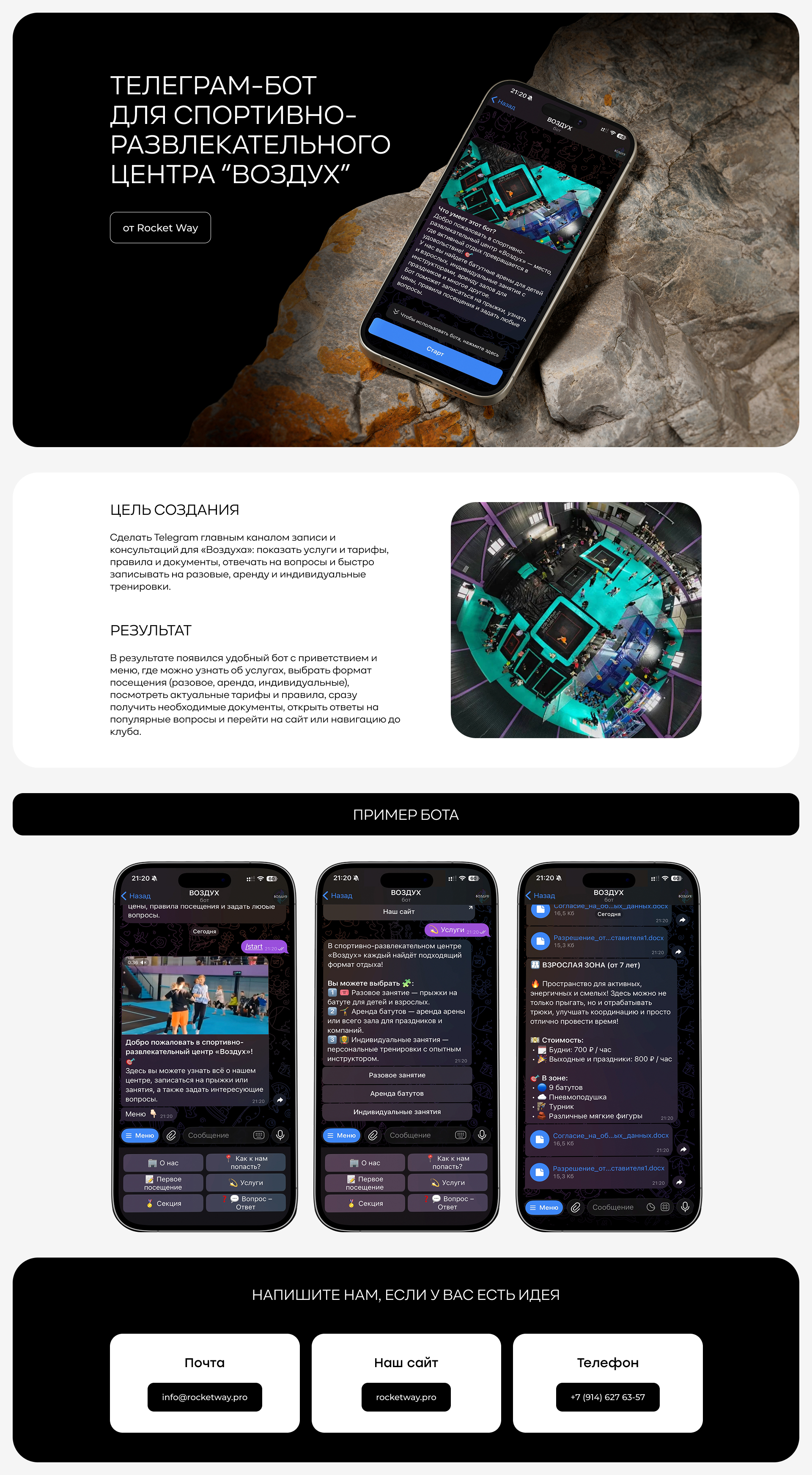 Разработали Telegram-бота для спортивно-развлекательного центра «Воздух»: бот показывает услуги и тарифы, отвечает на вопросы, выдаёт правила и документы, помогает выбрать формат посещения и быстро записаться на занятия и аренду.